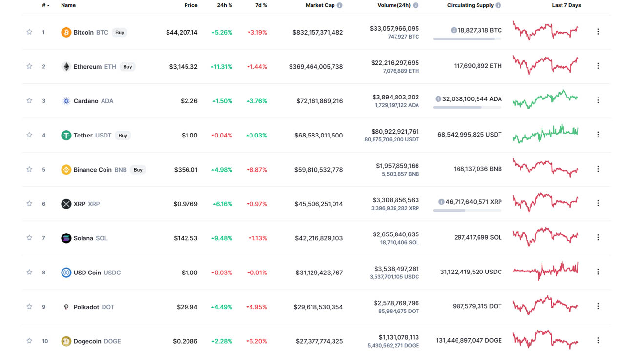 Coinmarketcap’ten derlediğimiz verilere göre son 24 saatte en fazla yükseliş gösteren kripto para birimi, Ethereum. 3.145 dolar seviyelerinden işlem gören popüler kripto para birimi, yüzde 11,3 civarında yükselmiş durumda. Ayrıca Cardano, Binance Coin, Ripple, Solana, Polkadot ve Dogecoin de yükseliş trendine girmiş durumda. Stabil coin olarak bilinen Tether ve USD Coin ise 1 dolardan işlem görüyor.